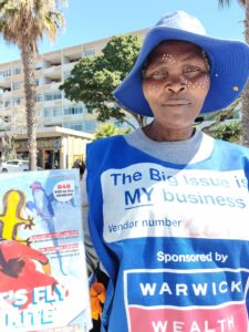 The one Big Issue Vendor we meet in The Big Issue #343 is Nomakhosina Sola, corner Beach and Three Anchor Bay Roads. Had to include a photo as she is the Vendor i buy my copy from every month.